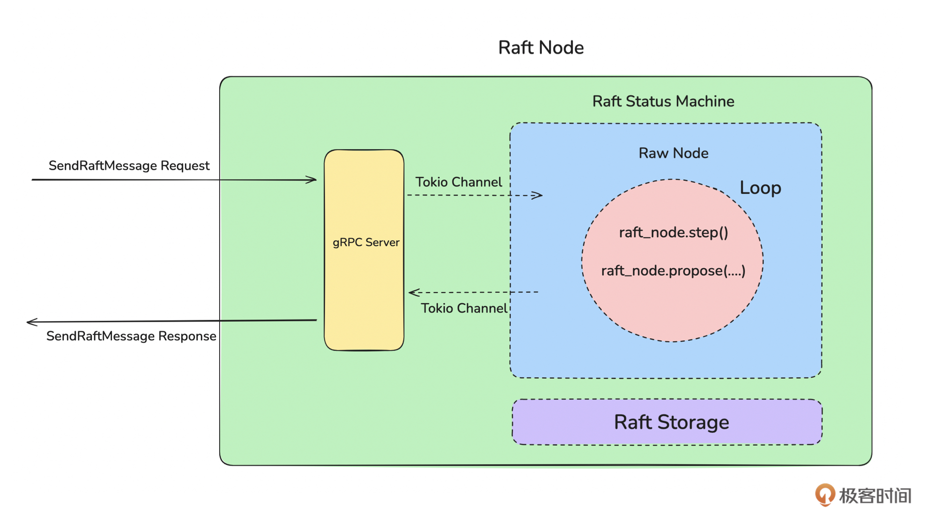 如上图所示,Raft Node 主要由 gRPC Server、Raft 状态机、Raft Storage 三部分组成。其中最关键的是 Raft 状态机,它驱动了 Raft Node 向前运行。从启动流程的角度看,服务启动后,会先启动 gRPC Server、初始化 RawNode,然后启动 Raft 状态机。Raft 状态机本质上是一个 Loop 线程,它会不间断地运行去驱动 RawNode 向前运行。