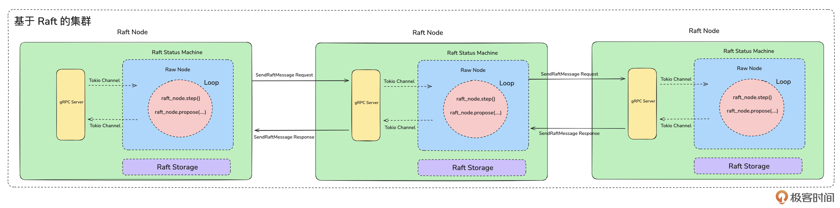 不管是 Leader 还是 Follower 的信息,当 Raft 状态机生成消息后,都会通过 Tokio Channel 将消息从网络层发送给其他节点。从而完成发起选举、投票选举 Leader、心跳发送等行为。所以,从集群的角度来看,整体架构图如下: